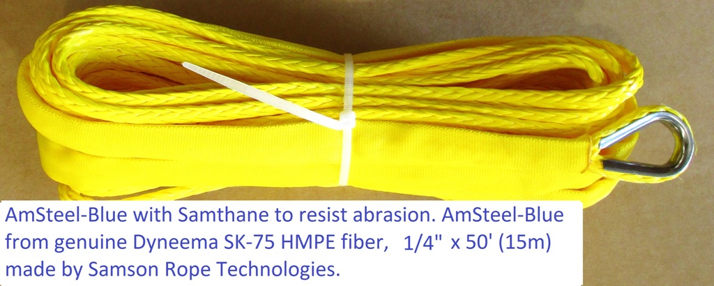 Superwinch synthetic ropes are genuine AmSteel-Blue with Samthane, a special coating to help resist abrasion. The raw material in AmSteel-Blue is made from genuine Dyneema SK-75 HMPE fiber, "which is the worlds strongest fiber" made by Samson Rope Technologies.